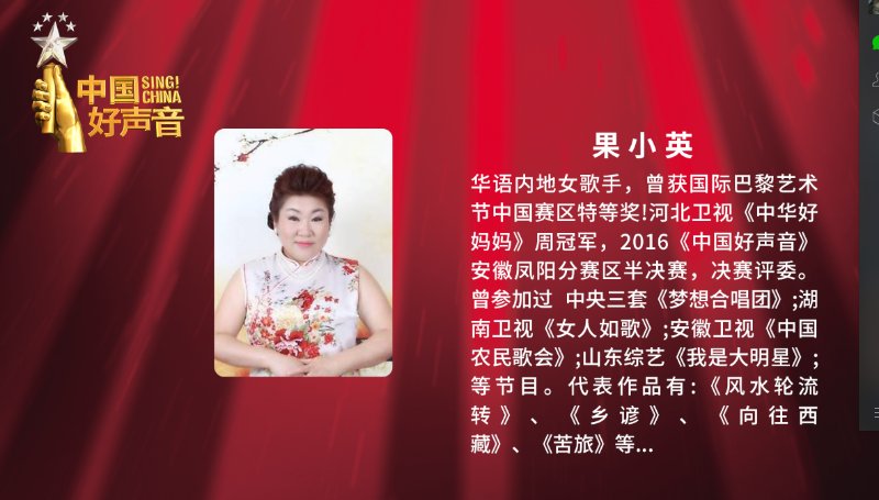 2016年6月特邀為中國(guó)好聲音安徽鳳陽(yáng)分賽區(qū)半決賽,決賽評(píng)委。